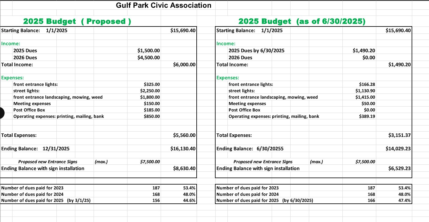The Gulf Park Civic Association collects $35.00 in annual dues each September for the upcoming year. While these dues are not mandatory, they play a crucial role in maintaining the safety and appeal of our neighborhood. Without them, our community would be less safe and less illuminated. The association covers 38% of the costs for the subdivision’s street lights, which are essential to enhancing safety and security.